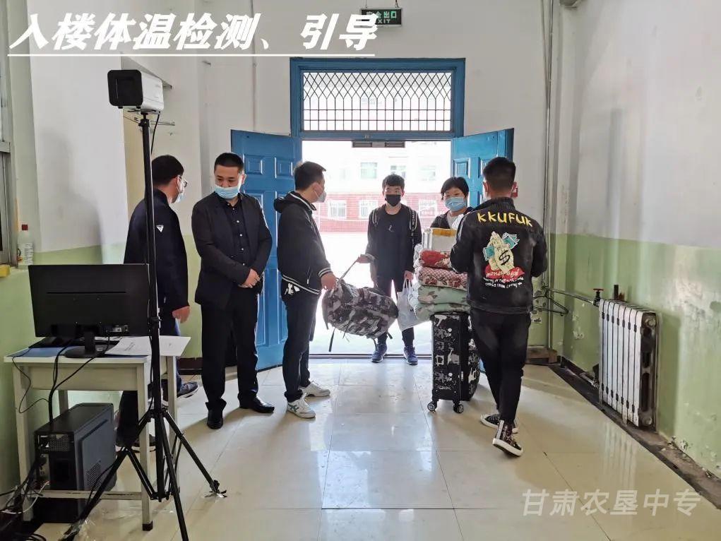 10日上午8:30,学校全体教职员工按照开学疫情防控值勤岗位安排准时到岗,引导返校学生按规定的入校、入宿舍路线,在相互间隔1米以上的距离排队,上交居住地相关健康证明、消杀行李物品、测温后有序进入学校。七里河区西果园镇卫生院也派驻了1名医护人员配合学校进行学生健康检测。学校2020年春季学期正式开启。
