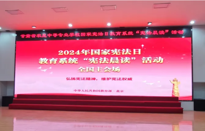 为深入学习贯彻党的二十大 、 二十届三中全会和全国教育大会精神,加强宪法法治教育,根据甘肃省教育厅有关通知要求,12月4日我校在西果园校区多功能大厅开展国家宪法日教育系统“宪法晨读”活动。全体师生近400人参加了教育部举办的国家宪法日教育系统“宪法晨读”直播活动。